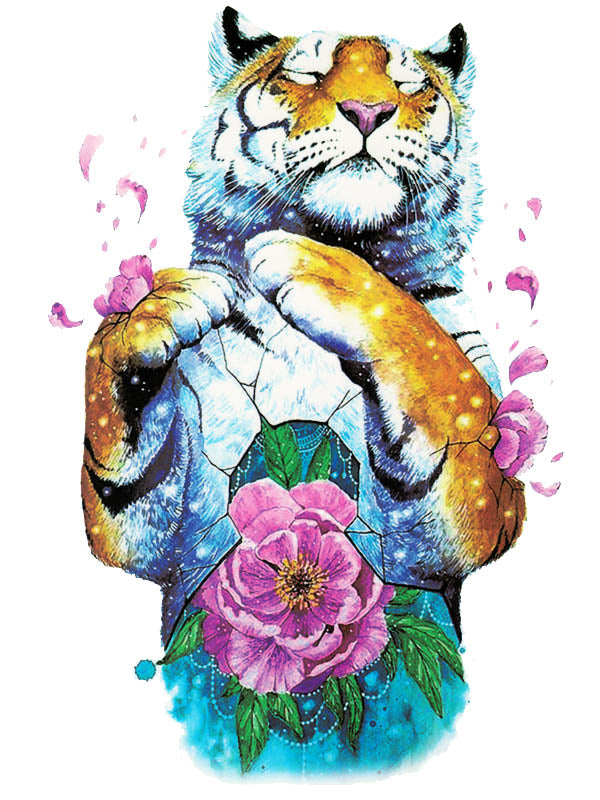 Ce tatouage représente un majestueux tigre dans une posture sereine, les yeux fermés et les pattes croisées sur son torse, comme dans un geste de gratitude ou de méditation. Ce symbole de force intérieure, d’équilibre et de respect de soi est magnifiquement rehaussé par un fond éclaté de couleurs qui évoque l’univers cosmos ou l’éveil spirituel.